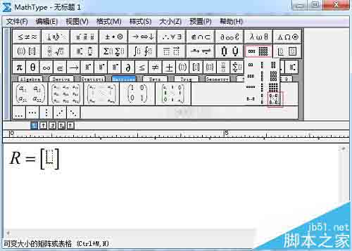 1、輸入方括號后,將光標放在括號中,在MathType工具欄中選擇“矩陣模板”——“可變大小的矩陣或表格”。