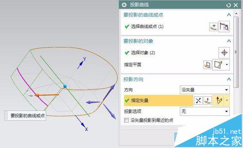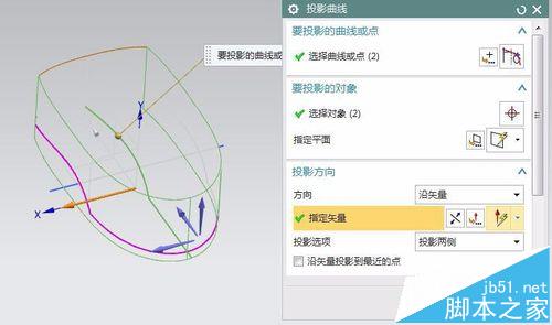4、創(chuàng)建投影曲線1。 單擊【曲線】|【派生的曲線】|【投影曲線】命令,在工作區(qū)中選擇上步驟創(chuàng)建的投影曲線1,將其投影到Z軸方向的側(cè)面上。