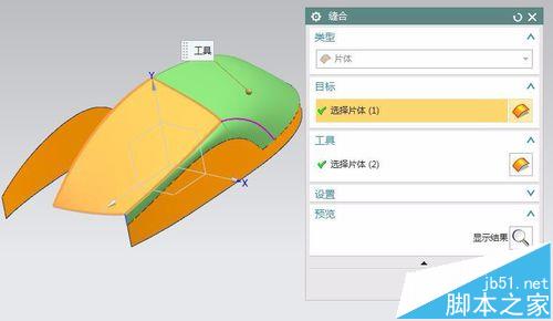 12、修剪片體。 單擊【插入】|【修建】|【修建的片體】命令,在工作區(qū)中選擇鼠標兩側(cè)面為目標,選擇前端面為邊界,結(jié)果如下圖所示。