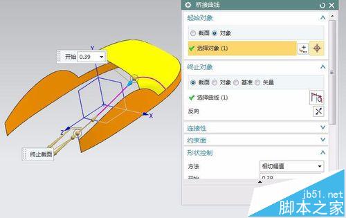 6、繪制藝術(shù)樣條。 單擊【曲線】|【藝術(shù)樣條】命令,在工作區(qū)中連接兩投影曲線與YZ平面的兩交點,在兩點間創(chuàng)建階次為3的藝術(shù)樣條曲線,結(jié)果如下圖所示。