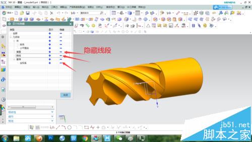 6、再用拉伸命令拉伸刀柄,如圖所示。隱藏掉草圖、曲線和坐標。刀槽處收尾有個螺旋升角,提取連線畫如圖的線條作掃描線,再畫一條螺旋線做引導線