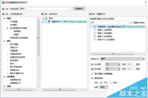4、當(dāng)從初始收縮狀態(tài)點(diǎn)擊成展開(kāi)狀態(tài)時(shí),設(shè)置鼠標(biāo)點(diǎn)擊用例,面板狀態(tài)選擇到“展開(kāi)”,并勾選推拉部件,方向選擇下方。