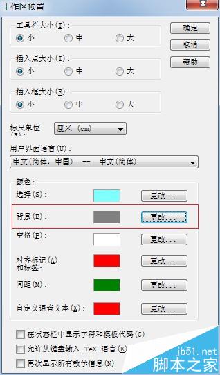 3、進入工作區預置后,會彈出一個“工作區預置”的對話框,在這個對話框的下部,有一個“顏色”功能,我們看到在“背景”這一欄中,顏色是白色,點擊“背景”后面的“更改”按鈕。