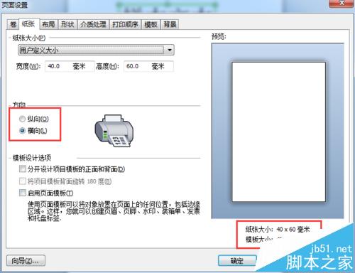 1、先將紙張方向選為“橫向”,此時,紙張大小自動變成了40mm*60mm,這樣看上去是正確了,但是模板大小也同樣變成了40mm*60mm,此時模板上的內容勢必是錯位的。