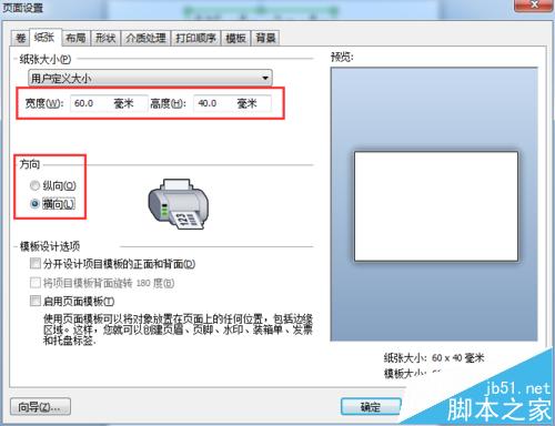2、所以這第二步則是關鍵點,需要將紙張大小設置為60*40mm。這樣雖然看上去和我們想要的結果不一樣,但因為紙張方向為橫向,所以實際上它在打印時,整個版面是旋轉了90度的。