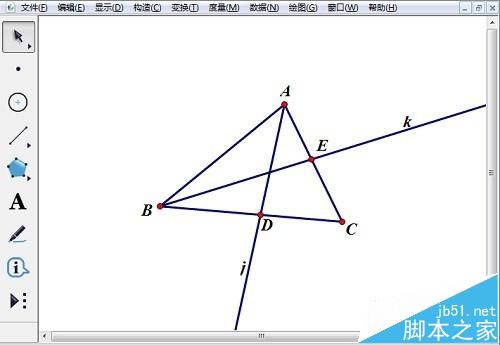 5、同時選中射線j和射線k,執行“顯示”—“隱藏平分線”命令,將兩條平分線隱藏。單擊“線段工具”,構造出線段AD和線段BE。單擊“移動箭頭工具”,單擊線段AD和線段BE的交點處(狀態欄提示:單擊構造交點),構造出線段AD和線段BE的交點F。