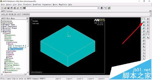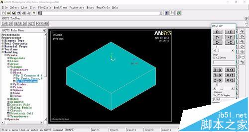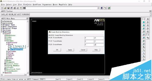 3、我們先繪制一個長方體,Main Menu>Preprocessor>modleing>create>volumes>block>by dimension,輸入長寬高的長度,分別為(0,3)、(0,1)、(0,3)。點擊OK即可。也可以更改視圖方向。