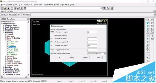 6、復制操作:Main Menu>Preprocessor>modleing>copy>volume,首先點擊圓柱體,單擊apply,然后在彈出的對話框中輸入1.5,再點擊OK,即可完成。