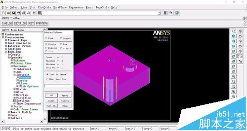 7、布爾求差運算:Main Menu>Preprocessor>operate>booleans>subtract>volume,首先選擇長方體,單擊apply,再選擇2個圓柱,單擊OK,效果圖如下圖所示。