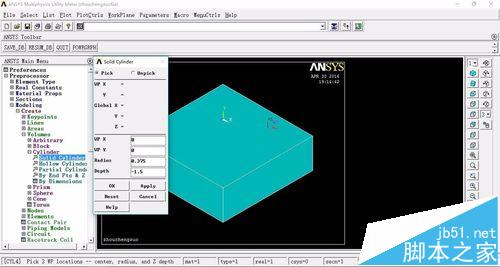 5、創(chuàng)建實心圓柱體,Main Menu>Preprocessor>modleing>create>volumes>cylinder>solid cylinder輸入位置(0,0),半徑0.375,深度為-1.5,即可完成圓柱體的創(chuàng)建。