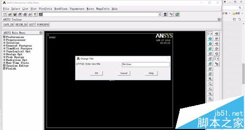 3、依次點擊Utility Menu>File>Change Title,彈出對話框,我們可以輸入example,點擊OK即可完成定義分析標題。 (/TITLE 命令)(右擊鼠標,選擇replot,則會刷新,會看到左下角出現file-lines)