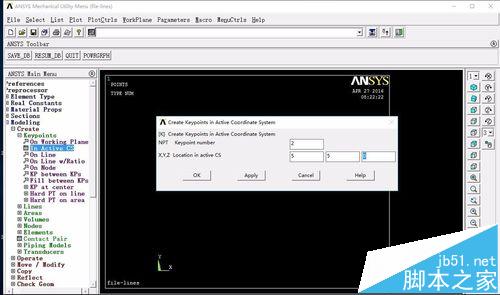 1、創建線條之前,得必須創建點,畢竟ansys不是專業的繪圖軟件,Main Menu>Preprocessor>modleing>create>areas>keypoints>on working plane,輸入原點坐標0,0,然后創建第二個點在in active cs,點的坐標為10,10,0.