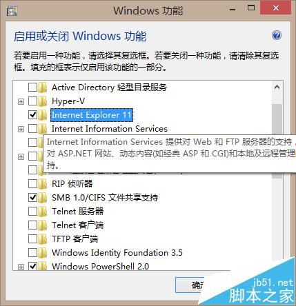 3、進(jìn)入后將Internet explorer11前的√去掉就行了。然后點(diǎn)擊確定。重啟一下電腦就OK了。當(dāng)然你要是想裝上IE11的話,添加上√就行了。