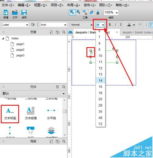 5、在state1中動態面板范圍內拖入文本標簽并輸入5,然后修改字體大小至合理