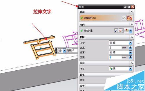 5、文字輸入完成后,我們直接點拉伸,可以使文字突出,這就相當于多出材料,如圖所示;