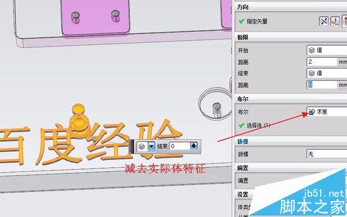 7、一般情況我們是減去材料,那么我們拉伸就需要布爾運算,直接選中模具模板,方向朝模板的方向,完成剪切材料,效果如下: