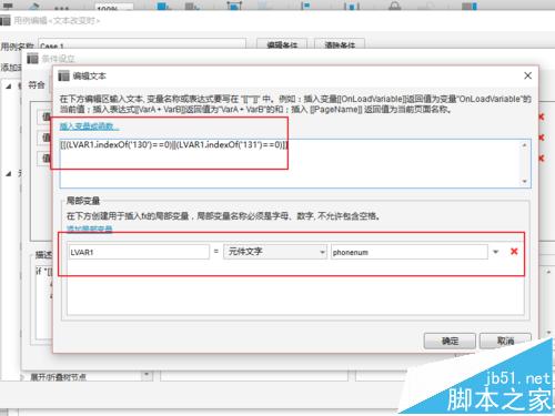 在case1上繼續(xù)添加判斷,插入變量利用indexof來(lái)判斷:130 131等號(hào)段是否出現(xiàn)在前三位即可,函數(shù):[[(LVAR1.indexOf('130')==0)||(LVAR1.indexOf('131')==0)]],LVAR1的設(shè)置參考下圖,依然是phonenum的元件文字: