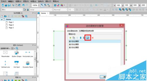 3、編輯輪播面板:在“動態面板狀態管理”彈出框中,點擊按鈕編輯新添加的3張狀態面板(按鈕見附圖,紅框已標出),如下圖: