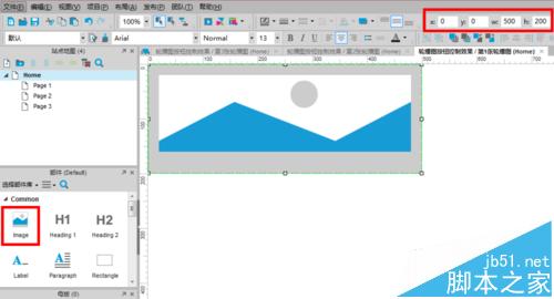 4、添加輪播圖片:在“第1張輪播圖”的標簽頁里開始編輯,首先元件庫(也稱為部件庫)里將“圖片”元件拖至編輯窗口內,并將位置和大小設置為0,將寬度和高度分別設置為500px、200px;鼠標雙擊已設置好的“圖片”元件,會彈出對話框讓你從電腦中選擇圖片,從而完成添加第1張輪播圖;