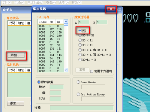 損失一個人數。進入添加代碼窗口,在“搜索過濾器”中的a中輸入3,b中輸入2。選中r0=a和r1=b。在cpu內存窗口中就會只剩一個地址,它就是1p的人數。選中這個地址,就會出現在“原始數據”的地址中,在“值”中輸入5。點“提交”,這個地址就被添加到金手指代碼中。