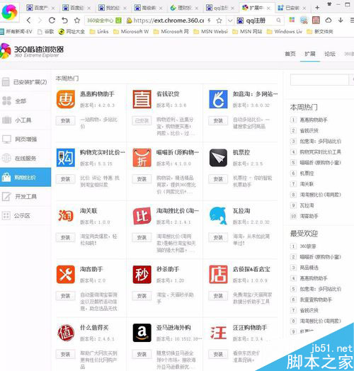 網(wǎng)購已成為我們?nèi)粘2豢煞指畹囊徊糠郑挥盟奶幑浣郑唐俘R全,來自四面八方的商品都有,甚至國外的也能買。可是怎么判斷商品的價格,口碑呢。綜合比較后,找到一款很好用的工具。 具體方法和步驟如下所示: 1.安裝一款瀏覽器,幾款主流瀏覽器都可以,像百度瀏覽器、360安全瀏覽器/360極速瀏覽器,傲游瀏覽器,等等。打開插件中心/應(yīng)用中心/擴展中心,就會看到各種各樣的插件。
