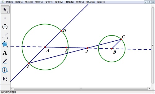 6、分別構造出直線JL和直線JM,即為所求的內公切線。隱藏掉多余的圓、點、線等即可。(怎樣在幾何畫板中畫數軸?幾何畫板中畫數軸教程 )