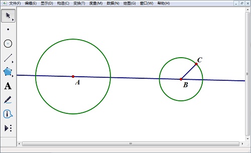 1、利用圓工具構造兩圓A、B,圓心分別為A、B,選中點A、B,選擇“構造”——“直線”;在圓B上任意取一點C,連接構造線段BC。(幾何畫板制作圓柱體的形成動畫演示方法 )