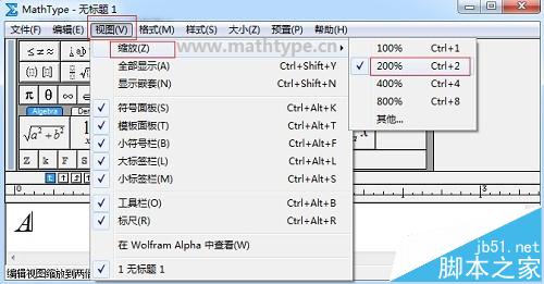 1、打開MathType編輯器后,選擇“視圖”——“縮放”,將比例選擇為200%或者更大。