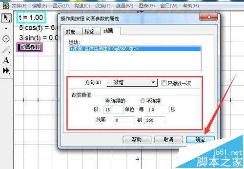 4、構建參數動畫。選中參數t,依次單擊編輯,操作類按鈕,動畫。方向選擇漸增,連續,速度為18每秒,范圍0到360,確定。這個參數的幾何意義是角度,所以選擇范圍如上。