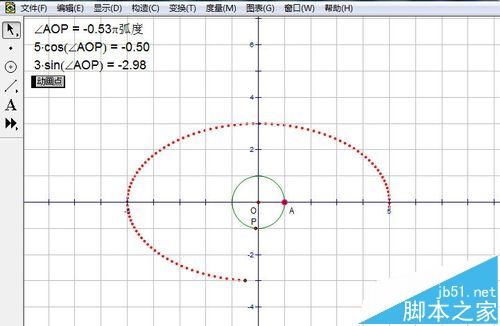 7、當參數的值達到360時,就畫出一個封閉的圖形,顯然它是橢圓。這種畫法的關鍵是建立一個參數,然后畫動點,最后建立參數動畫,而不是點動畫。