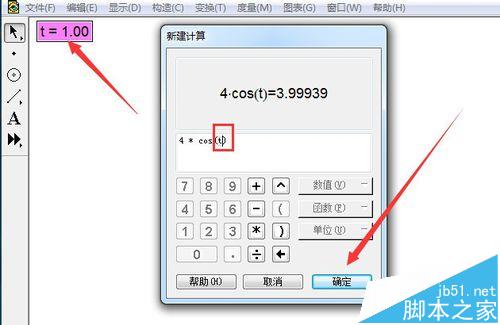 2、計算橫坐標和縱坐標的數值。單擊度量---計算,輸入公式5*cos(t),確定。同樣方法輸入另一個公式3*sin(t),這樣就算出了軌跡上的點的橫縱坐標,接下來就是畫點。