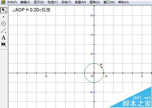 2、度量角度。單擊編輯---參數選項,把角度單位改成弧度。在單位圓上任意畫一點P,單擊選中A,O,P,單擊度量---角度。角AOP的弧度值就度量出來了。