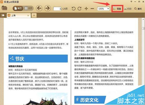 1、在極速PDF閱讀器的首頁右上方的位置,我們會看到有幾個應用功能菜單,包括“背景”、“打印”、“查找”等,我們選擇“背景”,如圖所示。