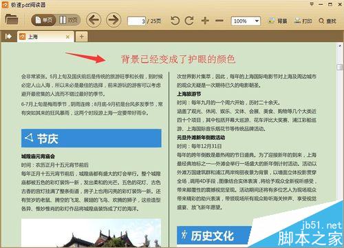 4、點擊“護眼”應用菜單以后,我們發現,原來的PDF文檔的背景是白色的,現在已經變成了一種淺綠色的背景,看起來對眼睛有好處,說明我們的設置已經成功,如圖所示。