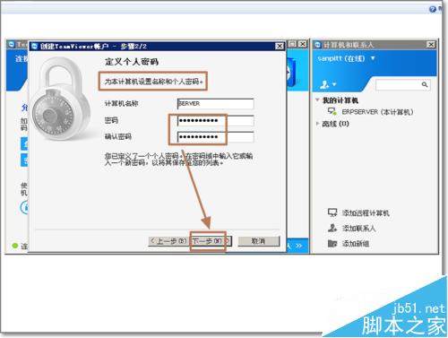 4、創建TeamViewer賬戶的過程中,同時要求定義個人密碼,這是密碼就是固定密碼,以后將做為這臺被控制電腦在另一個端訪問它的固定密碼。不用向對方詢問遠程控制的臨時密碼。