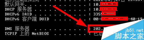 3.在命令窗口輸入命令ipconfig /all ,按下回車鍵,刷出一堆字,找打【NDS服務器】后面的ip地址就是了。