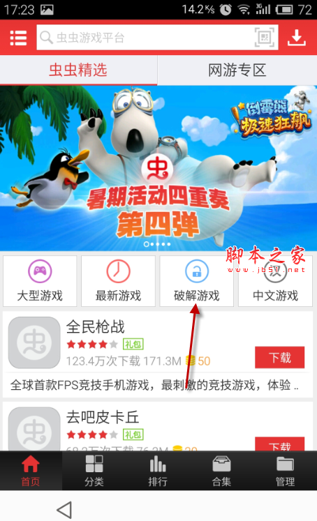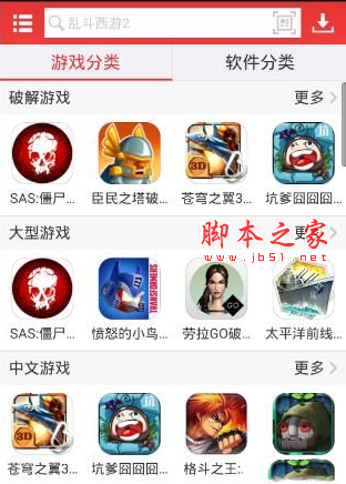 5、你也可以在分類界面,把游戲詳細(xì)的分類,有破解游戲,大型游戲,中文游戲,休閑益智,選擇你喜歡的游戲