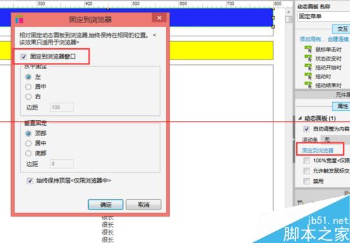 在工作區中拖入一個動態面板,設置其x和y坐標等于0,調整其寬度和高度分別為60和20,將動態面板命名為“固定錨點”,設置其固定到瀏覽器。