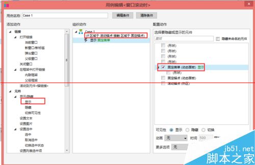 打開頁面交互面板,雙擊“窗口滾動時”事件,添加條件“元件范圍 滾動錨點 接觸到 元件范圍 固定錨點”,確定,設置動作為“顯示 固定菜單”。