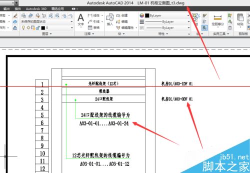 1、對于不能查看的內容做個對比,用T20繪制的機柜立面圖和線纜標識,可以全部顯示,查看標題欄,可以看到是用T20軟件打開,還是用Autocad打開,如下圖: