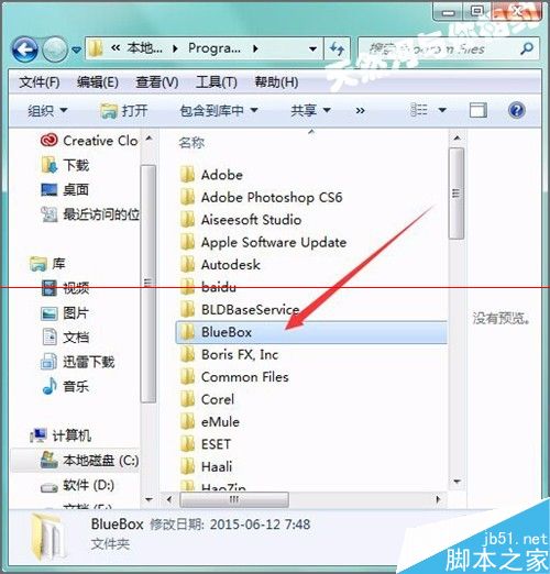 2、打開Program Files的文件夾后,在它彈出的列表中,我們可以看到有一個BlueBox的文件夾。這個就是藍光寶盒的文件夾。