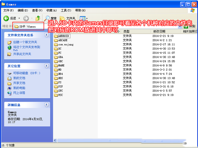 13、這里顯示的本地游戲目錄是:SD卡:/Games/,接下來要將手機連接到電腦,進入這目錄,這時可見Games文件夾下以機種為別建立了數個文件夾,如下圖