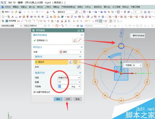 5、環(huán)形陣列:選中小圓作為要陣列的對(duì)象、選中大圓的圓心作為陣列的旋轉(zhuǎn)點(diǎn);