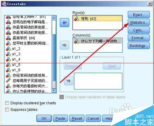 交叉表分析主要用來檢驗兩個變量之間是否存在關系,或者說是否獨立,其零假設為兩個變量之間沒有關系。我們在實際的工作中,經常用交叉表來分析比例是否相等。比如我們來分析一下,不同的性別對不同的報紙的選擇有什么不同,就是要用交叉表分析了,下面是具體的方法。