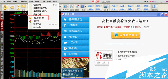 1.如下圖,您可以點擊“委托”菜單下的“模擬炒股”按鍵進入。
