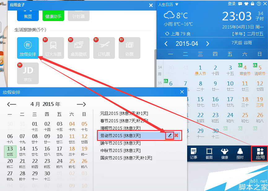 盤算好請假的同學們可以點擊人生日歷應用按鈕,找到放假安排模塊。點擊勞動節(jié)的編輯按鈕來進行拼假編輯。