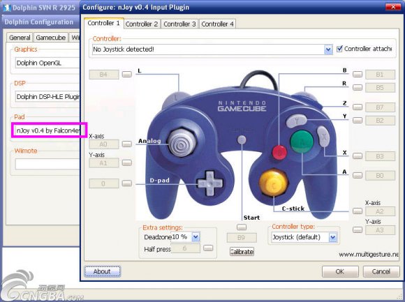 nJoy插件的設置項,在已接入手柄的情況下,模擬器會自動匹配按鍵,所以一般只采用默認設置即可。另外,似乎要使用PS系等手柄只能選擇nJoy0.3版插件。