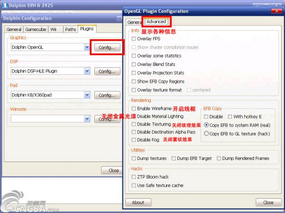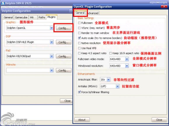 圖形插件的設置項說明,可選擇的插件有OpenGL和DX9兩重(這里以OpenGL為準,DX9的設置項基本跟OpenGL一致),對于配置較低的電腦可選擇關閉某些功能。