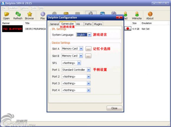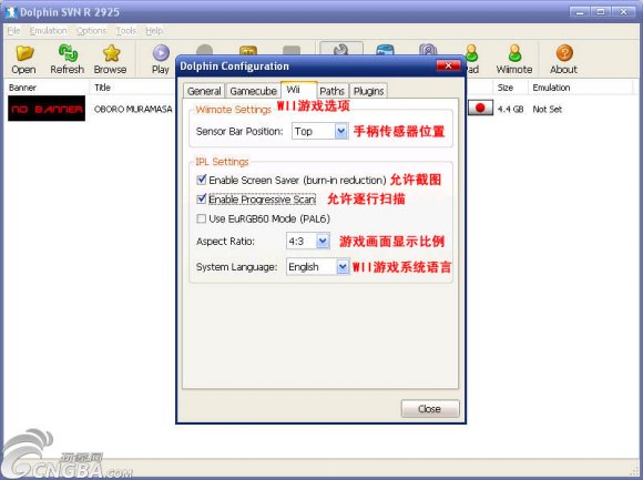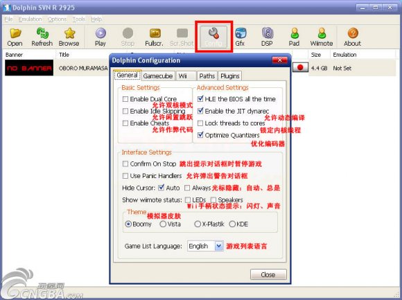 由于模擬Wii游戲會出現各種各樣的狀況,比如圖象品質、有聲無聲等狀況,以下對模擬器的各種主要的設置項進行簡單的說明,常用的設置項見圖片中文標識。
