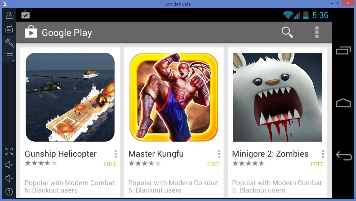 進入模擬器頁面,點擊瀏覽器按鈕,可以瀏覽網頁,也可以在網頁上下載應用。您也可以直接點擊Play store按鈕,登錄或者注冊一個Google賬號,即可直接下載游戲到Droid4X模擬器。